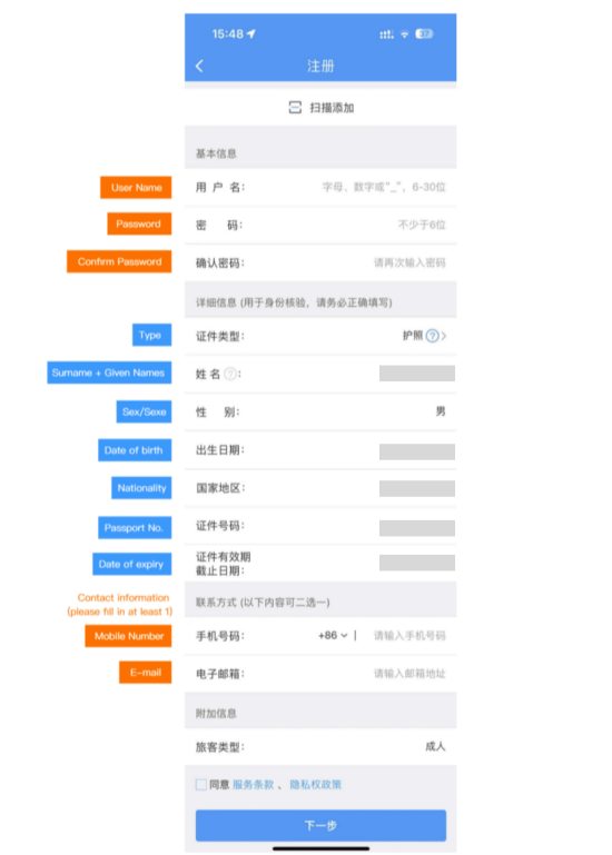 In the information filling section, foreign passport holders may select the "Type" (證件類型)from the drop-down list and choose "Passport" (護(hù)照), enter the information according to the prompts and ensure that the filled information precisely match their passport bio pages. Each user is also required to enter either an email addressor mobile phone numberin the Chinese mainland, Hong Kong, Macao or Taiwanfor contact.