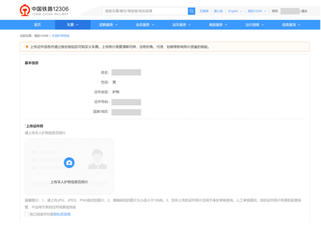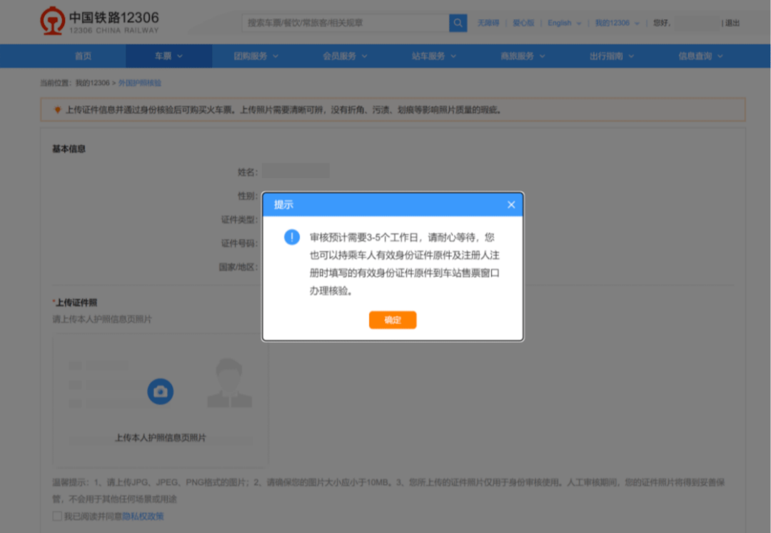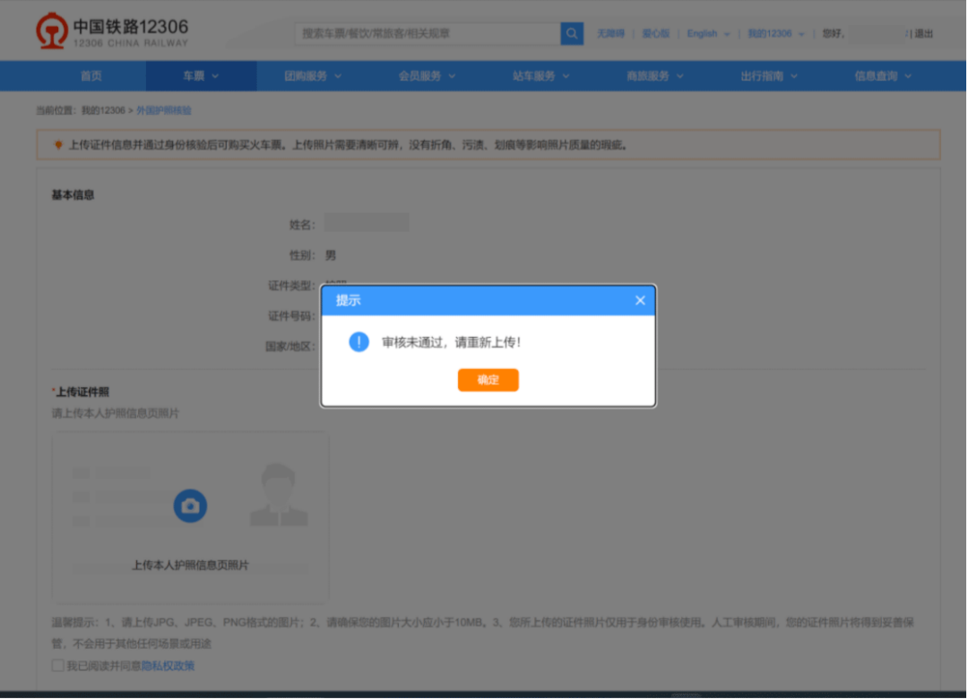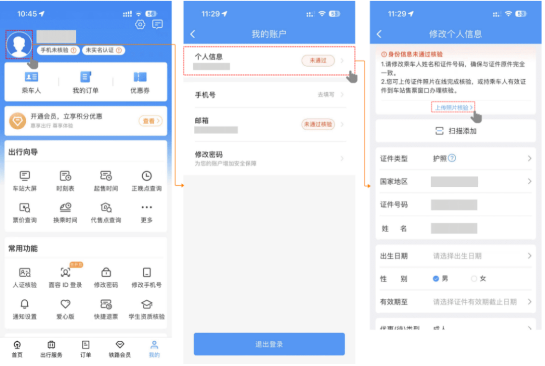 Users who have failed the identity verification may make modifications in the section of "Personal Information" (個(gè)人信息)and resubmit or go to the ticket counters with valid ID documents for verification or complete the identity verification by uploading the photocopies of their ID documents online.