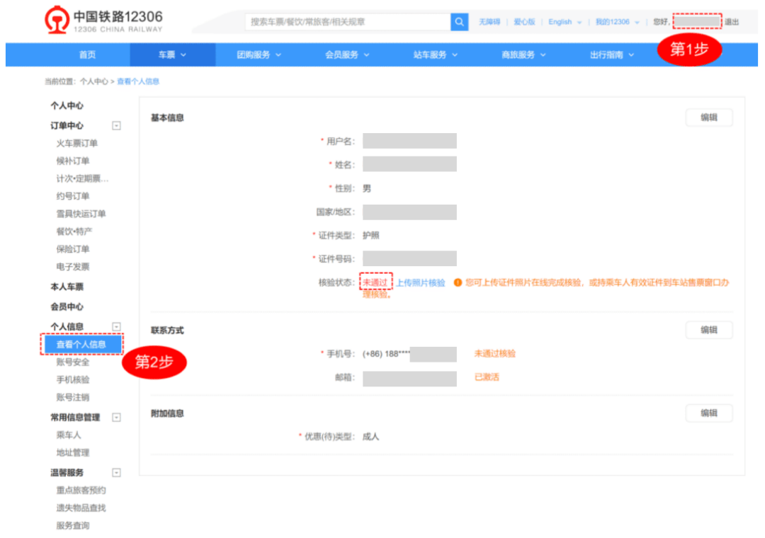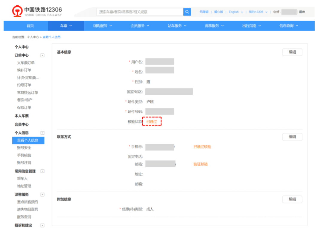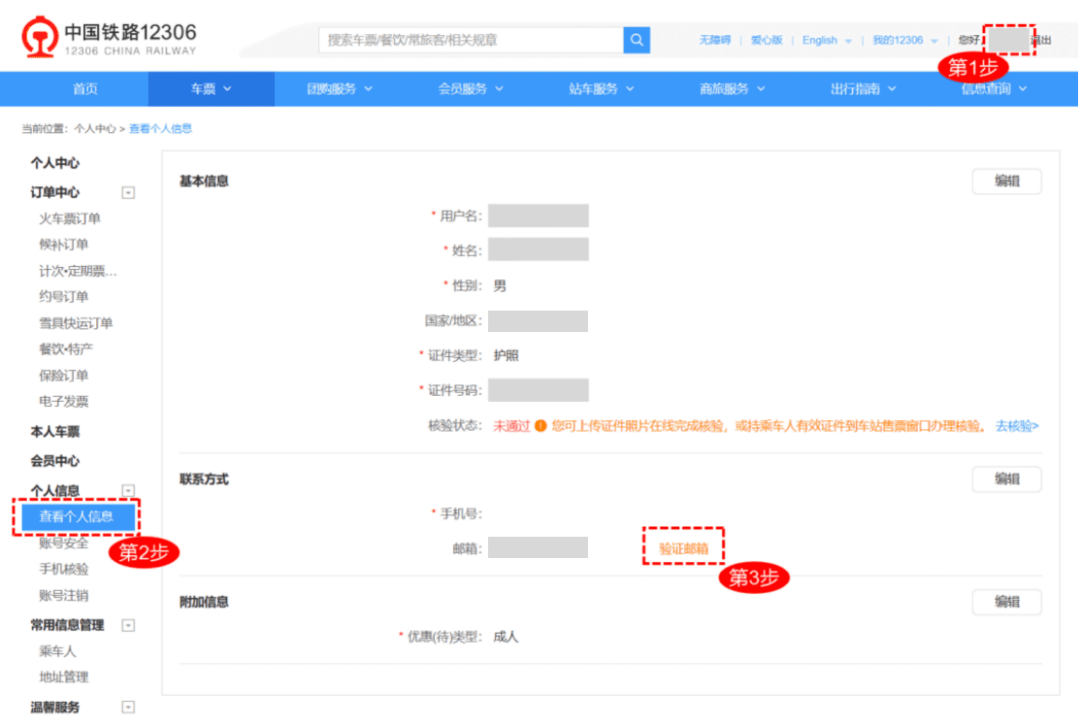 Via Website:"My 12306" (個(gè)人中心) – "View personal information" (查看個(gè)人信息) – "Edit" (編輯)