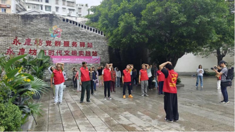 活動現(xiàn)場,紅棉老兵代表彪叔分享了參與志愿服務的經(jīng)歷與體會,并圍繞大型賽事服務注意事項進行講解。彪叔表示,作為紅棉老兵,要充分發(fā)揮退役軍人“五種力量”,在十五運會和殘?zhí)貖W會期間爭當表率、展現(xiàn)擔當。在健身環(huán)節(jié),持有國家職業(yè)健身教練資質的紅棉老兵譚教練帶領居民開展科學拉伸訓練,通過運動防護知識示范講解和“一對一”動作糾正,傳遞“從練兵場到健身場,使命同樣光榮”的健康理念。隨后開展的“榮耀永慶”健身行活動中,紅棉老兵與居民組成“榮耀方陣”,沿永慶坊青石板路有序行進,途經(jīng)麻石巷、騎樓街等特色街區(qū),在領略嶺南建筑風貌中深化軍民情誼,傳遞健康生活理念。