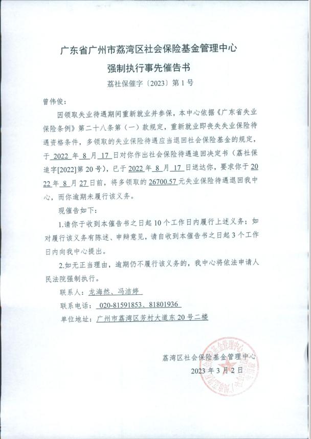 經(jīng)查,你(445322198901******)在領(lǐng)取失業(yè)待遇期間重新就業(yè)的情況,不符合《廣東省失業(yè)保險條例》第二十八條第(一)款規(guī)定,重新就業(yè)即喪失失業(yè)保險待遇資格條件,多領(lǐng)取的失業(yè)保險待遇應當退回社會保險基金。此前我中心向你發(fā)出《退款通知書》(荔社?!?022〕291號)、《社會保險待遇追回決定書》(荔社保追字〔2022〕第20號),要求你提供你本人廣州市內(nèi)工行、農(nóng)行、建行、中行、郵儲等銀行賬號,存入足額金額,待我中心劃撥。或?qū)⒍囝I(lǐng)的失業(yè)保險待遇匯入廣州市社?;鸸芾碇行馁~戶,而你逾期未履行該義務?,F(xiàn)我中心向你發(fā)出《強制執(zhí)行事先催告書》(荔社保催字〔2023〕第1號)。由于無法與你取得聯(lián)系,現(xiàn)公告送達《強制執(zhí)行事先催告書》(荔社保催字〔2023〕第1號)。本公告自發(fā)布之日起經(jīng)過30日,視為送達。